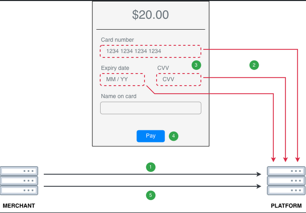 This integration method does not require PCI DSS Level 1 certification, as all sensitive payment data is processed and stored on our platform.